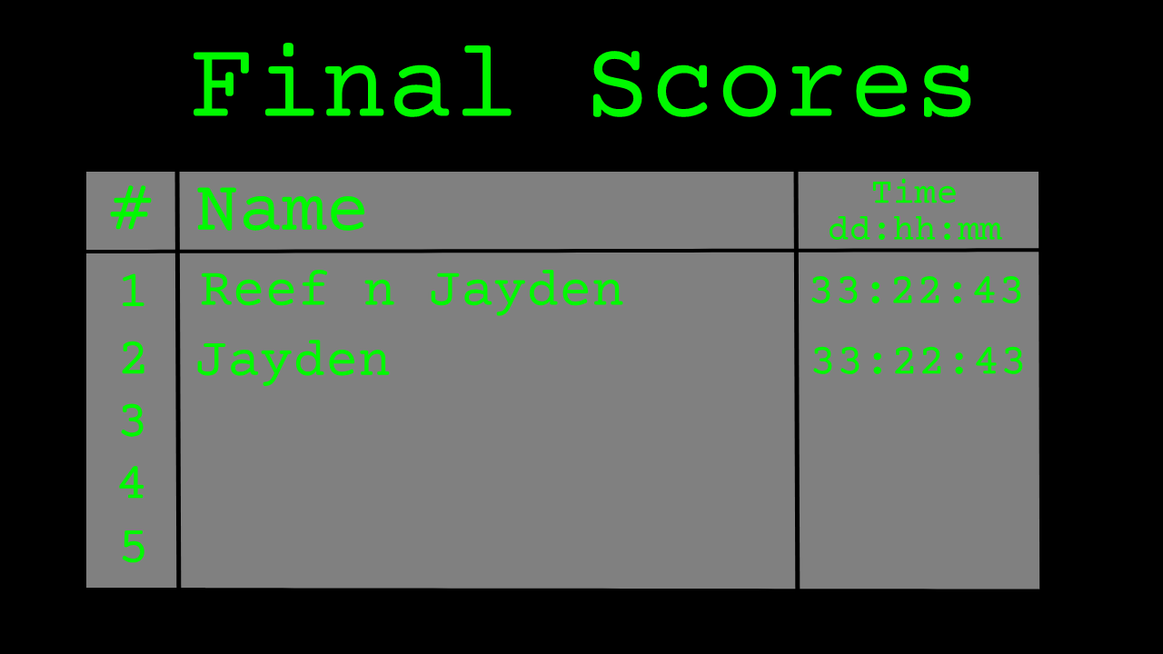 Congratulations to everyone who participated in the first ARG I have ever made. Even if you didn't make it really far, I still hope you found it to be fun. I have learned a lot of different things that did good and didn't do so good. I will make sure the next ARG is better than this one. Don't forget to check back every so often to see if something has changed. This website will be getting some renovations. In the mean time, brush up on some codes, ciphers, and other ARG related things because the next one is coming, and coming soon.